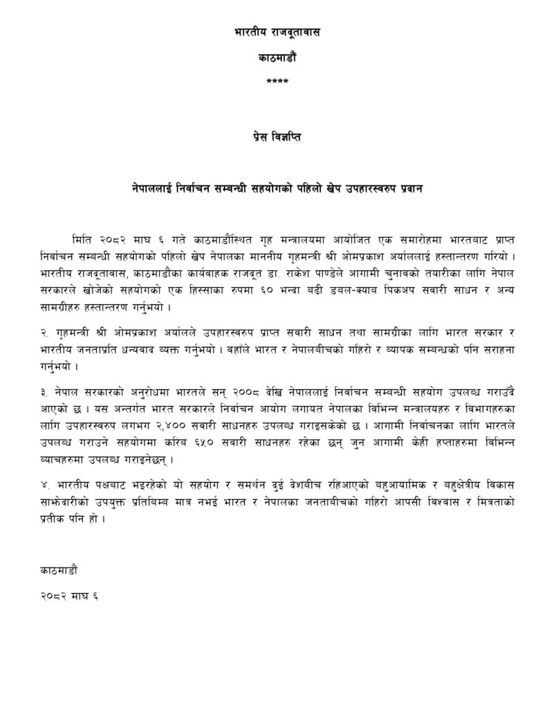 ६ माघ,काठमाडौं : भारत द्वारा प्रदान गरिएको निर्वाचन सम्बन्धी सहयोगको पहिलो खेप आज काठमाडौंमा आयोजित समारोह बीच नेपालका गृहमन्त्री ओमप्रकाश अर्याल लाई हस्तान्तरण गरियो।